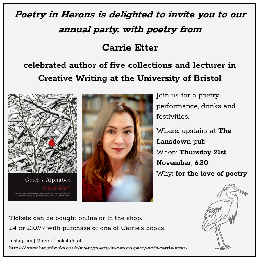 Carrie Etter has published five collections of poetry, most recently Grief’s Alphabet, described by The Guardian as ‘An impassioned reckoning with the aftermath of Etter’s adoptive parents’ deaths’. Her previous collections are The Tethers, winner of the London New Poetry Prize; Divining for Starters; Imagined Sons, shortlisted for the Ted Hughes Award for New Work in Poetry; and The Weather in Normal, a Poetry Book Society Recommendation. Her poems have appeared in The New Republic, The New Statesman, The Penguin Book of the Prose Poem, Poetry Review, and The TLS. She lectures in Creative Writing at the University of Bristol.